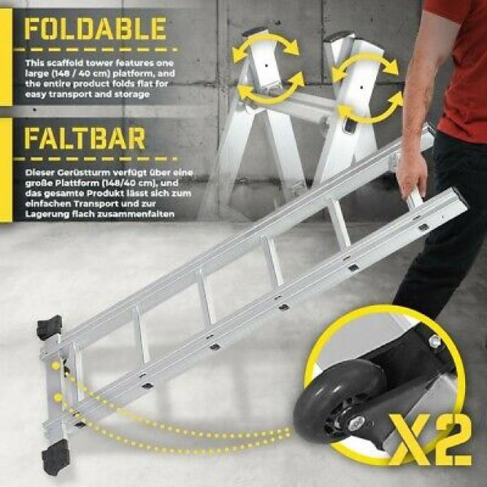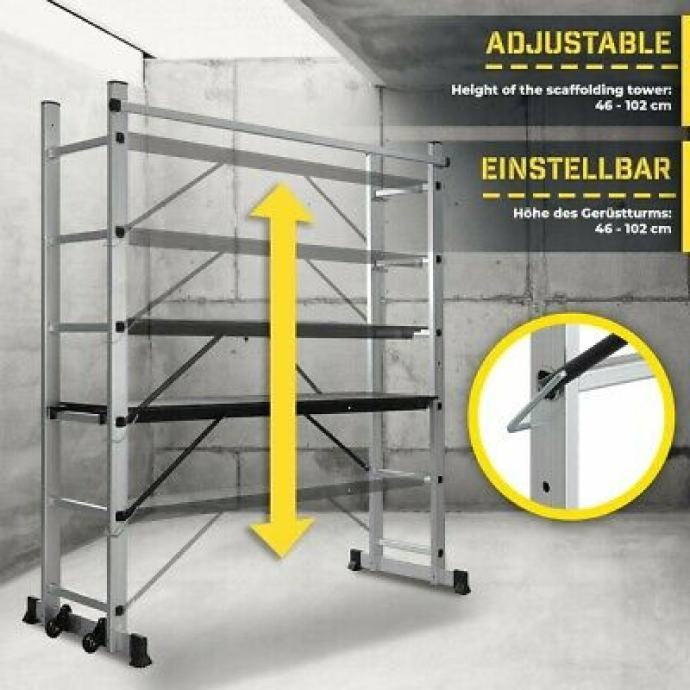 Jago® skela - radna visina maks. To je čini iznimno svestranom i jednostavnom za skladištenje i transport. Ovaj sustav skela je praktično i čvrsto rješenje za bilo koji nadzemni projekt.Baugerüst (B/ H / T): 160 / 171,5 / 66 cmEinstellbare Arbeitshöhe: 46 - 102 cmBreite der beiden einzelnen Leiter (mit/ohne Haken): Innen/außen: 29,5 / 34,5 cmInnen/außen: 36 / 41 cmEinzelne Höhe der Leiter: 171,5 cmDoppelleiter kombinierte Höhe: 280 cmPlattform (L / B): 148 / 41 cmSprossenabstand: 28 cmMax. Belastung: 150 kgGesamtgewicht: 15 kg