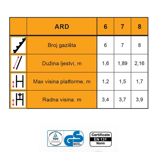 • DIMENZIJA PLATFORME 150x50 cm * Ljestve posjeduju certifikat EN 131, što znači da su izrađene u skladu s europskim standardom o sigurnosti rada na ljestvama.