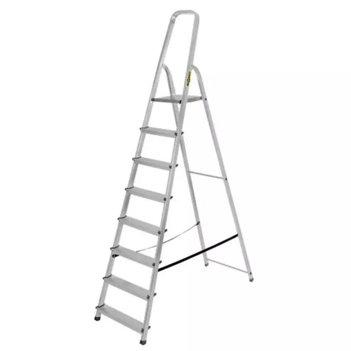Aluminijske ljestve nosivosti 150 kg, namijenjene su za korištenje u kućanstvima. Njihova mala težina čini ih idealnima za svakodnevno korištenje. Platforma i gazište sigurni su protiv klizanja, a non-slip opremljene stope štite od klizanja i prevrtanja. TEHNIČKE KARAKTERISTIKE: • BROJ GAZIŠTA: 8