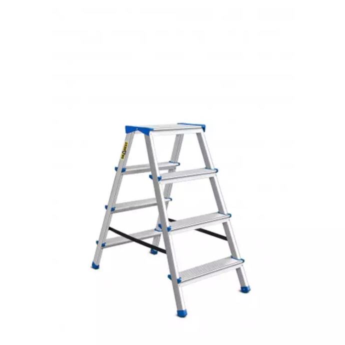 Aluminijske samostojeće ljestve s obostranim pristupom kompaktnih su dimenzija i vrlo praktične za korištenje i skladištenje. Zbog nosivosti od čak 150 kg, osim za kućnu, mogu biti i za profesionalnu uporabu. Širina gazišta od 80 mm omogućuje duže stajanje na ljestvama bez umaranja, a platforma je dizajnirana tako da se na ljestvama može i sjediti prilikom obavljanja nekog posla. Platforma i gazište su osigurani od klizanja, a stope protiv proklizavanja i prevrtanja. TEHNIČKE KARAKTERISTIKE: • BROJ GAZIŠTA: 4