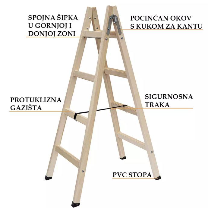 Drvene ljestve izrađene su od drveta lipe, a namijenjene su za najrazličitije potrebe, mogu se koristiti kod različitih visinskih radova kao što su soboslikarski, voćarski, limarski, električarski... Pocinčani okov za ljestve s kukicom za kantu Protuklizna naborana gazišta PVC stopa protiv proklizavanja Spojne šipke u gornjoj i donjoj zoni Polipropilenska sigurnosna traka TEHNIČKE KARAKTERISTIKE: