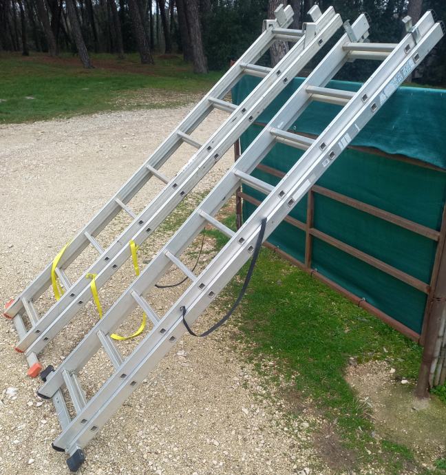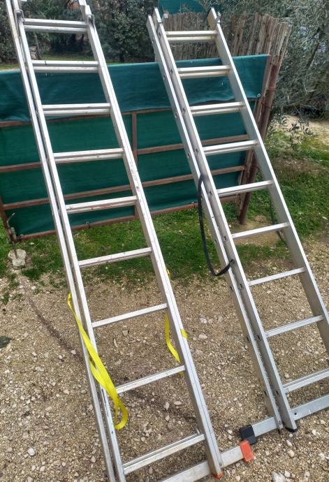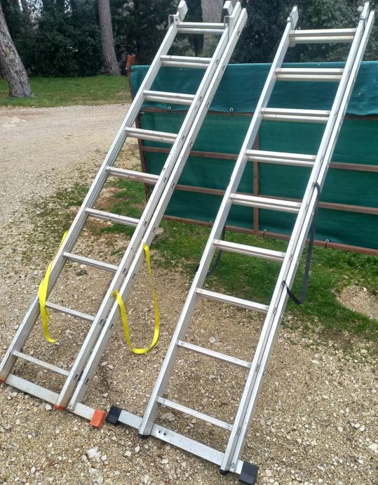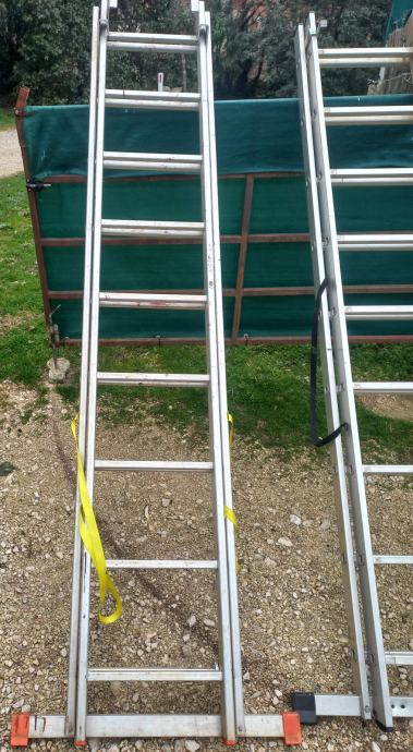 Aluminijske ljestve mogu se raširiti na A, odvojiti ili produžiti na dužinu od 4m. Ljestve se sastoje zasebno od 2 komada dužine 2.5m sa 9 gazišta, jake i čvrste konstrukcije. Navedena cijena je po komadu, a za obe cijena dogovor.