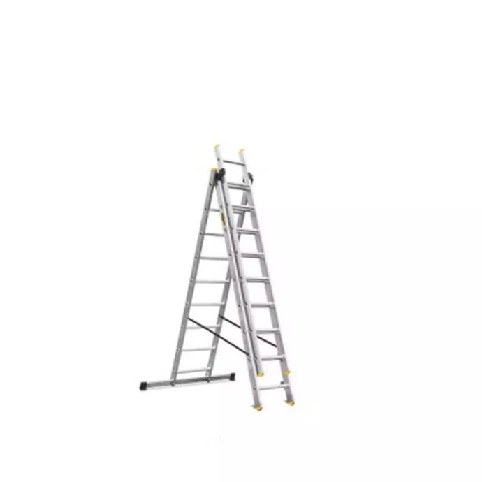 Ljestve za profesionalnu ili kućnu uporabu, mogu se slagati u tri različite formacije. Njihovo sklapanje omogućuje jednostavan transport i skladištenje, a imaju iznimnu visinu dohvata. Izrađene su od čvrste aluminijske konstrukcije što ih čini stabilnim i sigurnim. Protiv klizanja su osigurane specijalnim stopama i protukliznim rebrastim prečkama, a dodatnu sigurnost im pružaju polipropilenske trake. TEHNIČKE KARAKTERISTIKE: • BROJ GAZIŠTA: 3x9