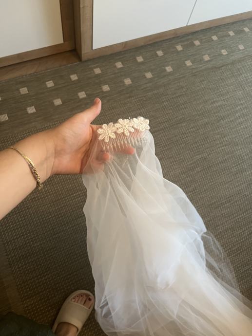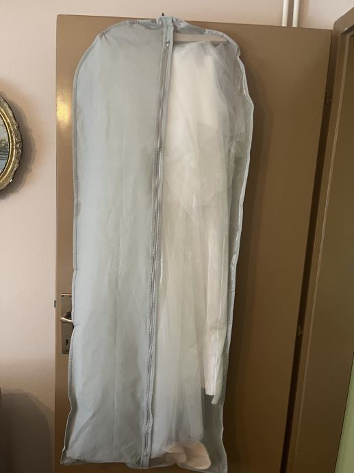 Jako dobro očuvana. Uz nju dolazi i pripadajući veo. Lagani rukavi se mogu stavljati na ramena ili spustiti ispod ramena.