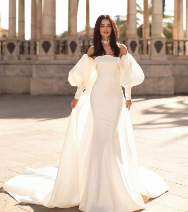 Veličanstvena i elegantna vjenčanica savršena za raskošan mladenkin izgled. Usko krojena silueta od satena u obliku trube prati liniju tijela te ima korzet bez naramenica s volanom koji naglašava dekolte, kao i suknju u stilu sirene s uskim šlepom. Uz dodatni plašt, haljina dobiva na volumenu te uključuje predivan šlep od iznimno mekanog satena.
