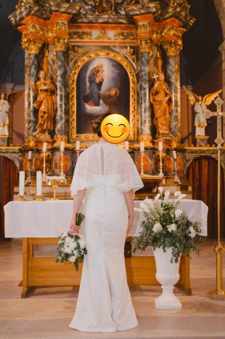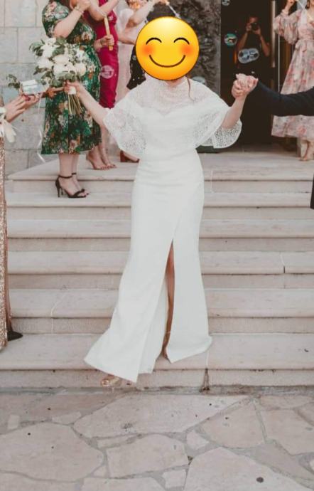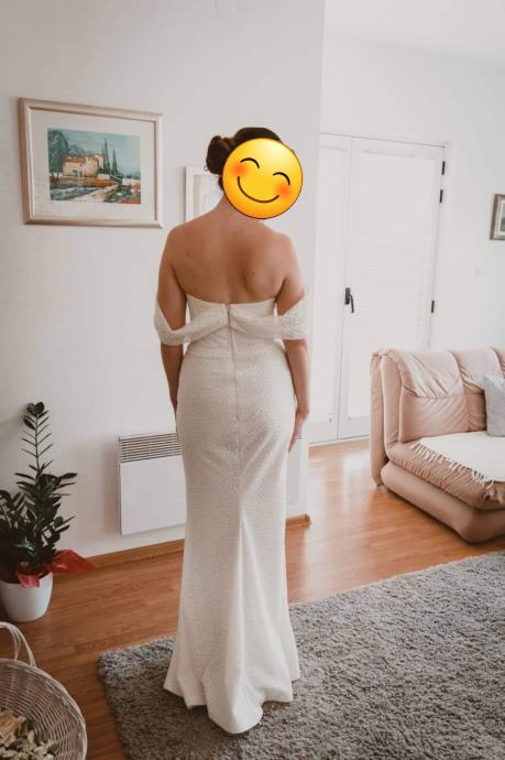 Veličina vjenčanice je 36/38 (moguće je skratiti/suziti), moja visina 174cm + 7 cm štikle koje sam nosila.