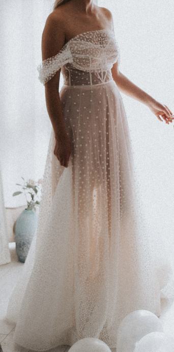 Prodajem vjenčanicu Envy room, kolekcija 2022. Šivana po mjeri, otprilike odgovara veličini 42. Nošena je na vjenčanju i fotografiranju nakon vjenčanja. Uz nju poklanjam i veo.