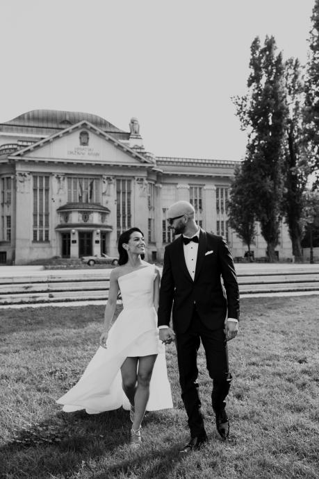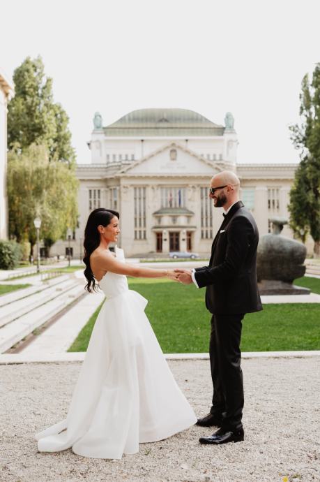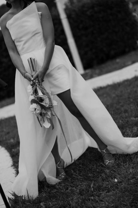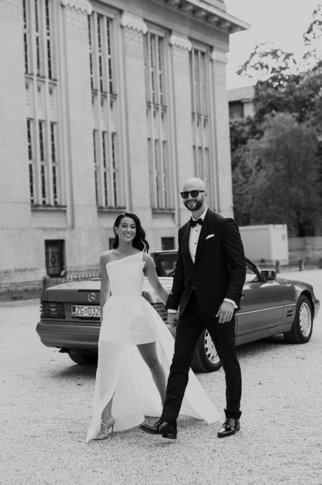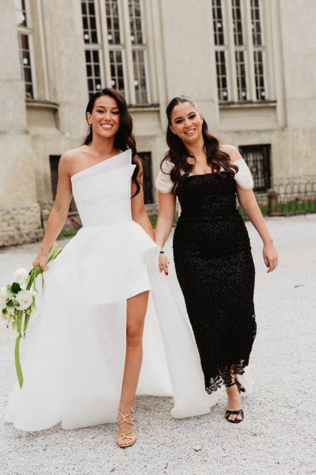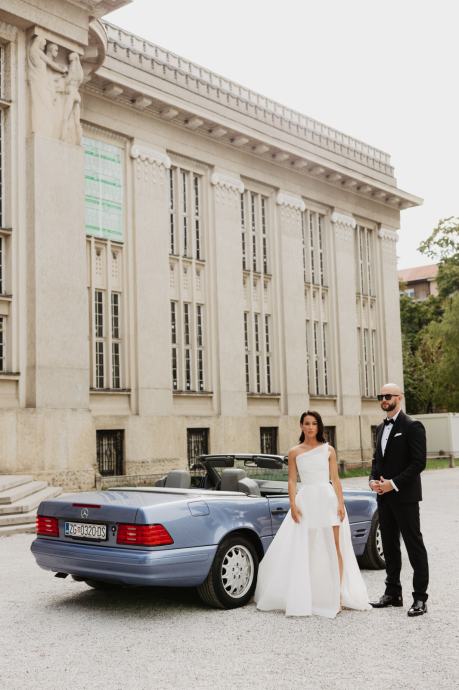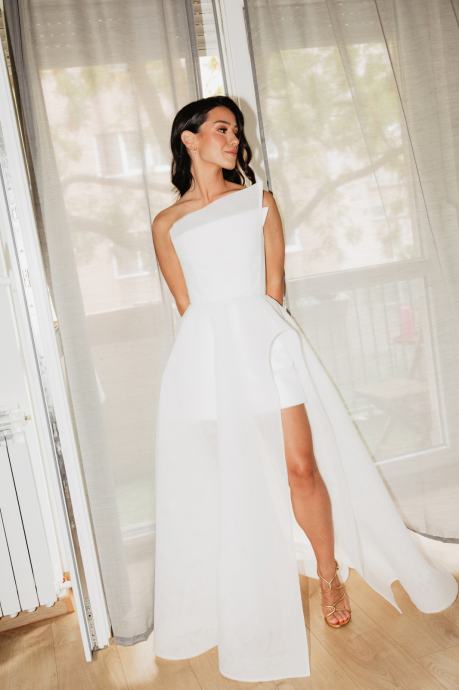 Sastoji se od kratkog kombinezona i tila u obliku haljine koji se može skinuti. Nakon skidanja tila ostaje elegantan, udoban mini kombinezon – savršen i za večernji dio vjenčanja. Nije potrebna dodatna haljina.