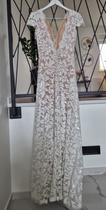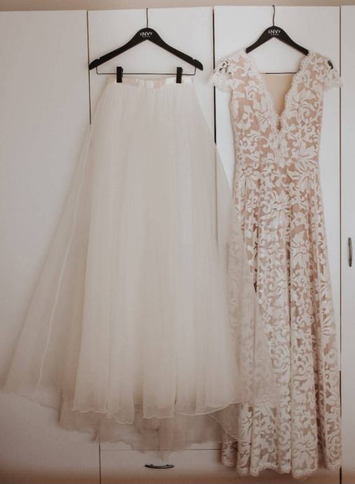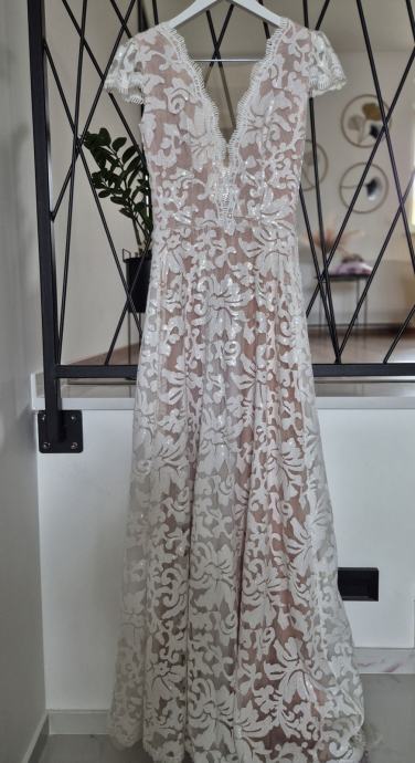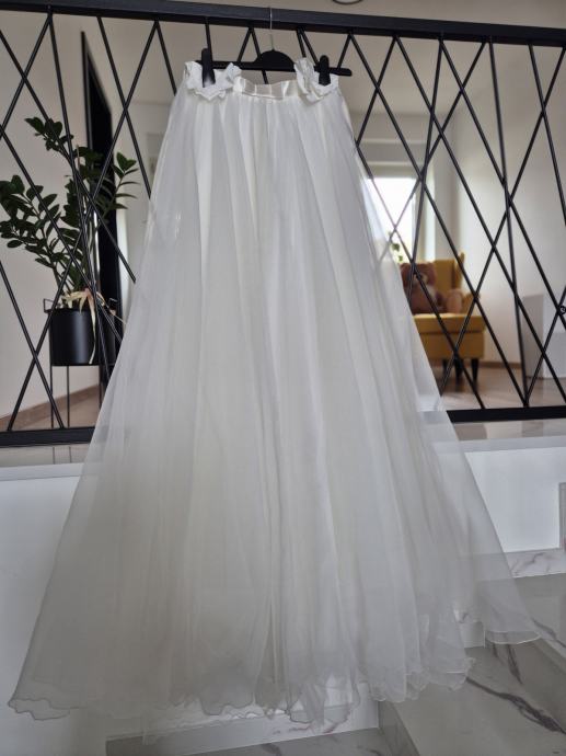 2u1 vjenčanica, jednom nosena, kemijski ociscena bez ostecenja. Odgovara velicinj S/M, za visinu 175 cm plus stikla 7 cm. Mogucnost slanja postom, kao i proba na relacija Krapina, Zg po dogovoru. Uz vjenčanicu dolazi i veo.