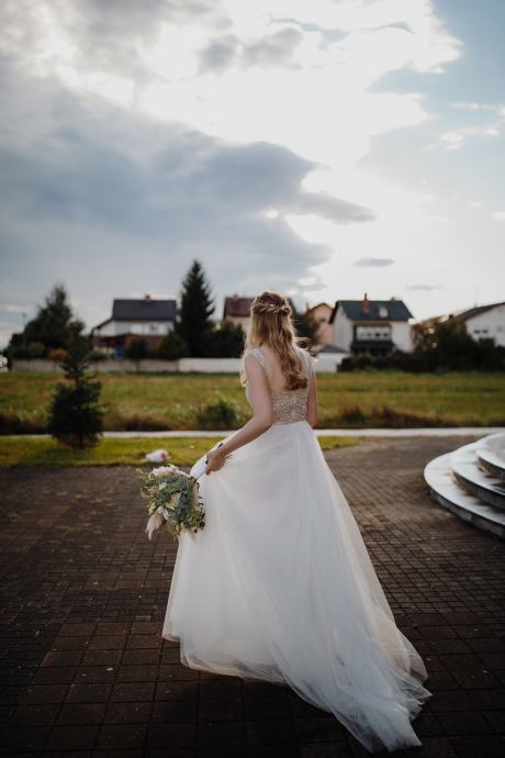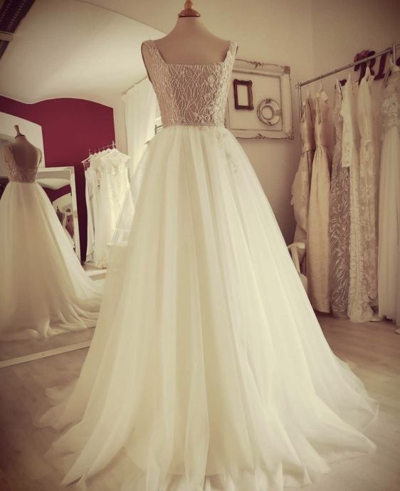 Prodajem jednom nošenu i kemijski očišćenu vjenčanicu. Vjenčanica je predivna unikatna, brenda G Blue by Gabrijela Kanižaj. Veoma je lagana, prilagodljiva, ugodna za nošenje i vrlo lako prilagodljiva za bilo koju visinu. Napravljena je za ukupnu visinu 185cm, može se kratiti veličinu 36/38. Dolazi sa originalnom vrećom i kutijicom s plavom podvezicom.