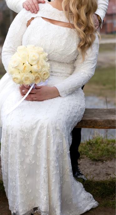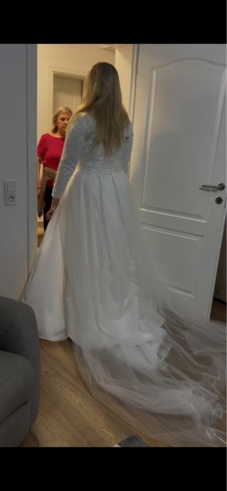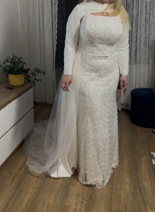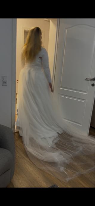 Iznajmljujem prekrasnu vjenčanicu u bjeloj boji s dugim rukavima i elegantnim čipkastim detaljima. Haljina ima klasičan kroj koji naglašava figuru, s delikatnim vezom i aplikacijama po cijeloj dužini. Dolazi sa skidivim velom koji dodaje dodatnu romantičnost i eleganciju.