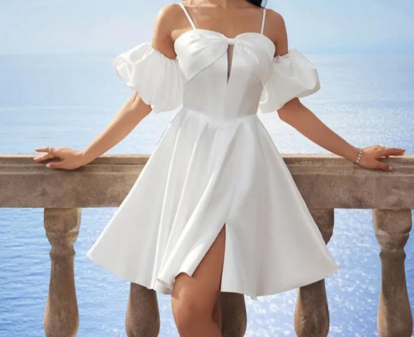 Elegantna bijela haljina s otvorenim ramenima I puf rukavima u obliku slova A, s visokim prorezom.
