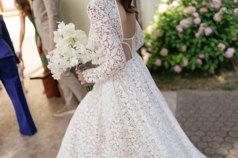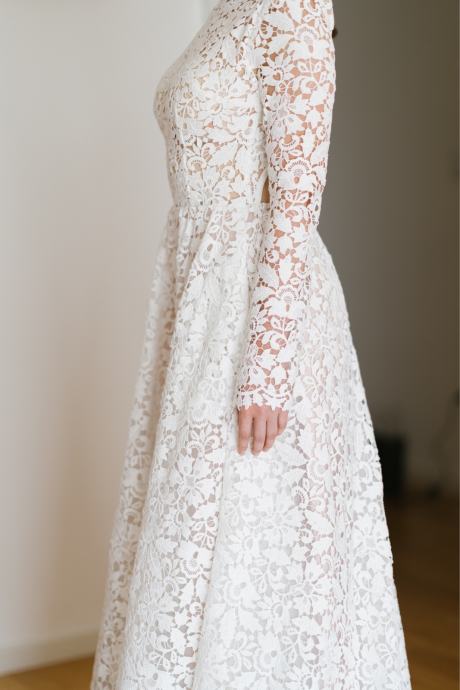 Haljina je nosena za crkveni dio vjencanja, izradena je od rucni sivane cipke. Ima šlep koji se za potrebe plesa moze prikvaciti na straznji dio haljine.
