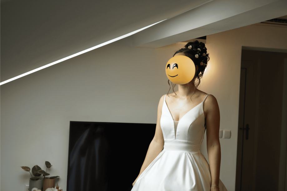 Vjenčanica trenutno odgovara više veličini S, ali se može vrlo lako proširiti na veći broj (M). Moja visina je 170cm, nosila sam cipele visine pete 7cm i kolut ispod vjenčanice koji se može podesiti tako da se proširi ili skupi i odgovara različitim visinama bez da se haljina krati. Ima i lijepi šlep koji se može zakačiti (na jedan gumbić) tako da ne smeta za ples i hodanje.