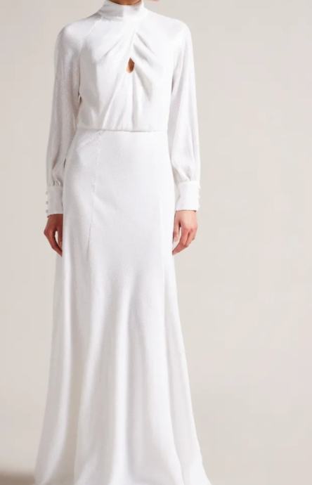 Nova, nenošena duga bijela haljina, dugih rukava, A kroja. Zbog visokog reza pogodna i za trudnice.