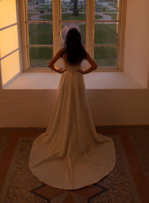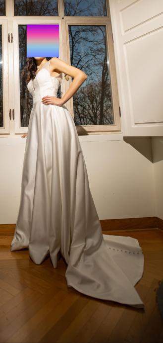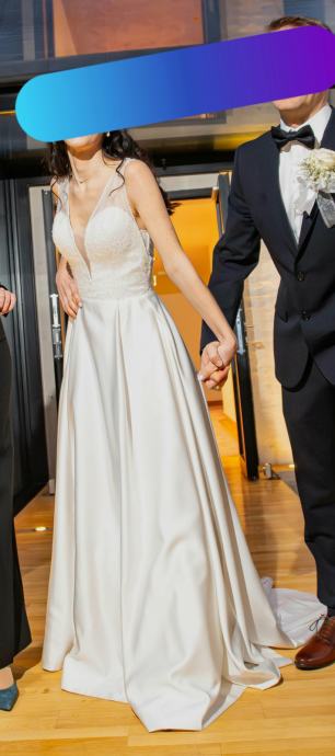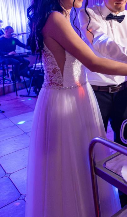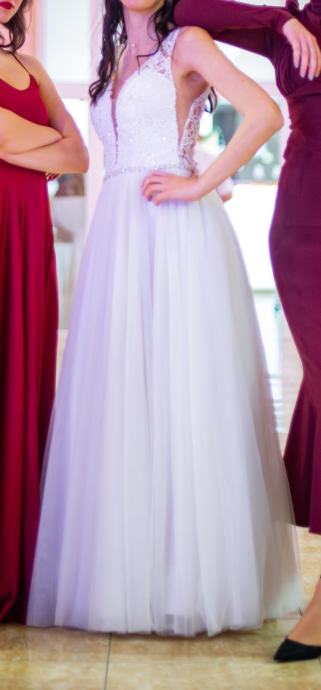 Prva duža sa šlepom, donji dio od satena; druga kraća, čipka i til, odlična za plesanje i skakanje (ja sam 168 cm i na malu petu od cca 5 cm mi je bila 0,5-1 cm od poda).