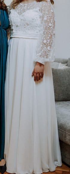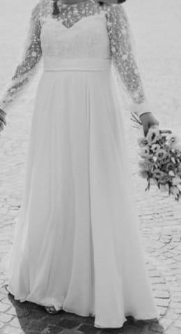 Prodaje se ručno šivana vjenčanica po mjeri. Nošena je samo jednom te je očišćena na kemijskom. Gornji dio je sašivan od čipke, doljni od satena. Jako je lagana i udobna te efektivnog izgleda. Mjere su: 104 prsa, 92 struk i 112 bok. Može se slobodno probati.