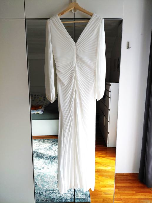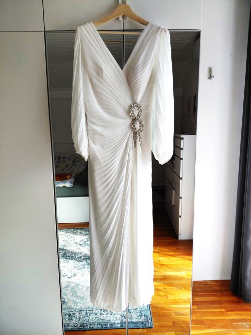 Prodajem svečanu bijelu haljinu koju sam nosila na svom vjenčanju iza ponoći. Skraćena je prema mojoj visini (165 cm i visina pete 4 cm). Odgovarala bi veličini L. Haljina je bez oštećenja, udobna i dobro stoji.