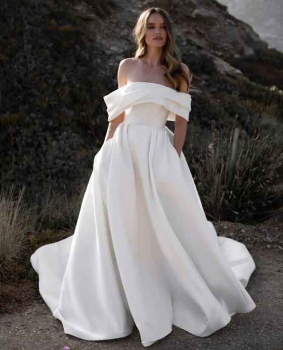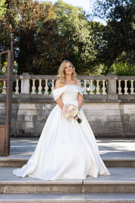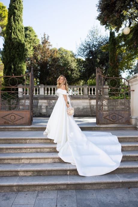 Prodajem elegantnu i sofisticiranu vjenčanicu klasičnog kroja s bogatom suknjom i dugim šlepom. Haljina ima predivan off-shoulder dizajn, koji naglašava ramena i dekolte te dodaje dašak kraljevskog stila. Materijal je kvalitetan, čvrst, ali lagan i udoban za nošenje.