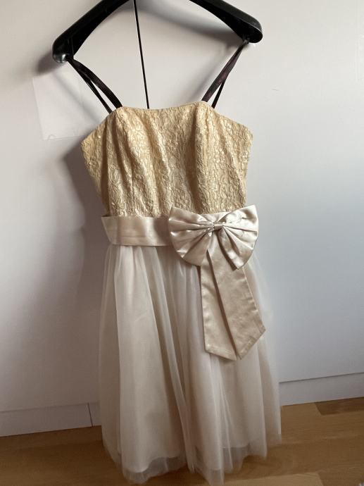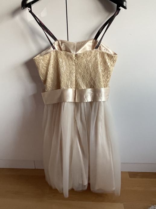 Zlatne boje.jednodijelna haljina koju čine čipkasti “korzet” i suknjica od tila.