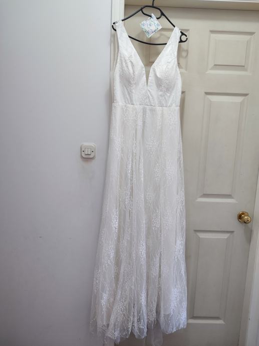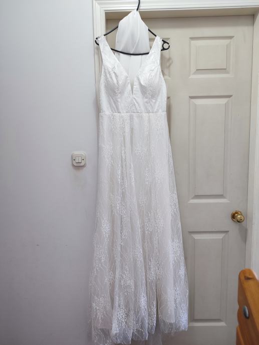 Prodajem novu vjenčanicu nikad nošenu. Bijela boja. Visoka sam 178 cm. Vjenčanica ima preko čipkasti til koji se moze korigirati ( npr.ako zelite skratiti duzinu-moze se rezati). Veličina M. Na poklon dobivate bijelu maramu.