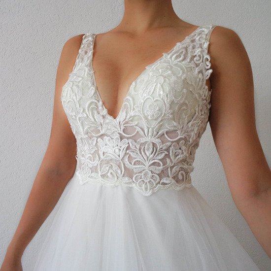 Vjenčanica je rađena po mojim mjerama. Prsa: 85, struk: 70. Visoka sam 1,73 m i nosila sam cipele od 6 cm. Haljina je čista i nema oštećenja. Možete doći i isprobati.