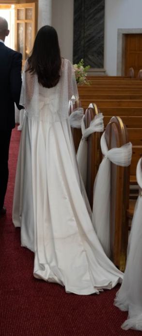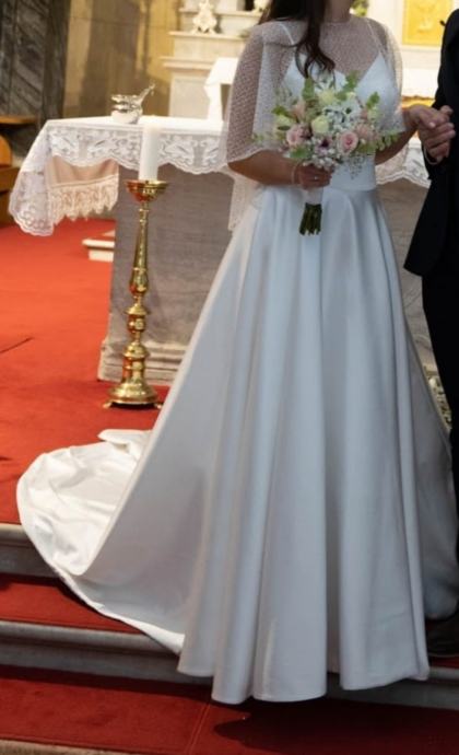 Vjenčanica ima dva dijela, gornji dio se otkopčava na patent a donji dio ima til kao podstavu. Mašna se moze skidati. U cijenu je uključen pončo koji je nošen u crkvi. Kemijski oprana. Gratis jastuk za prstenje.