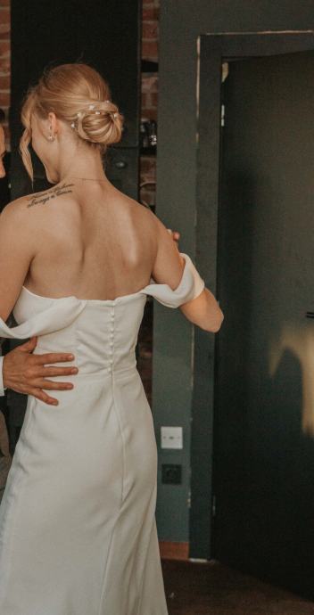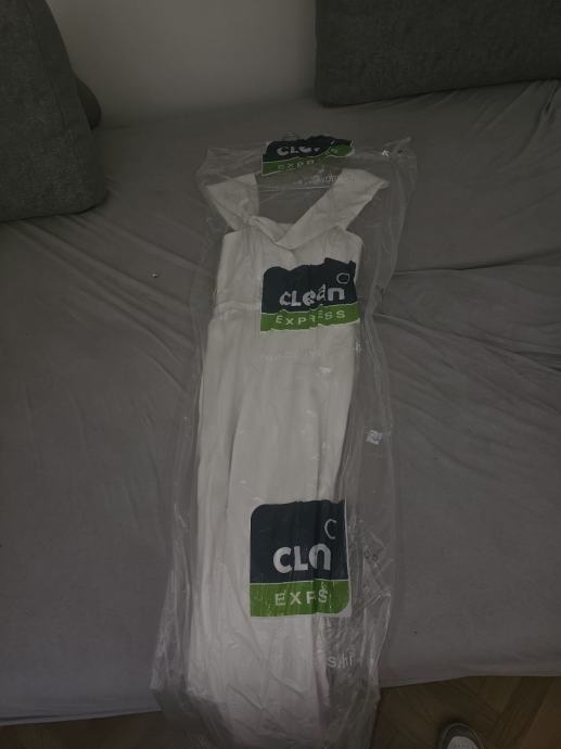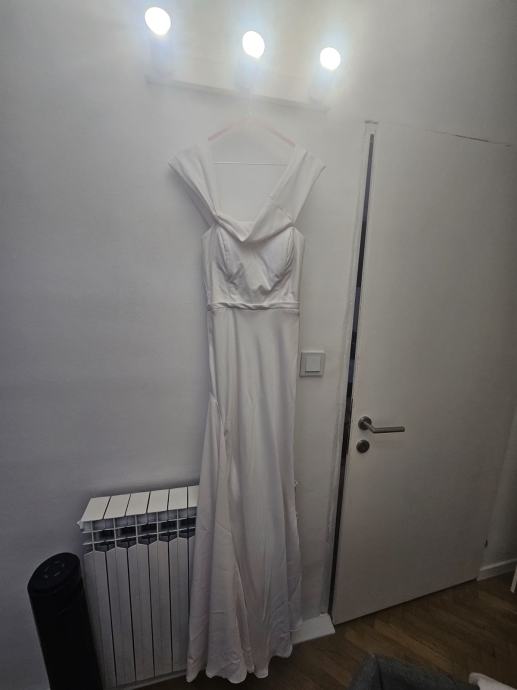 Bijela, lepršava i ugodna za nošenje. Ugrađena podstava za grudi i korzet. Niska leđa, zatvara se na zatvarač, ukrasni gumbi. Ušivene vezice kako bi se mogao svezati "šlep". Pada niz tijelo.