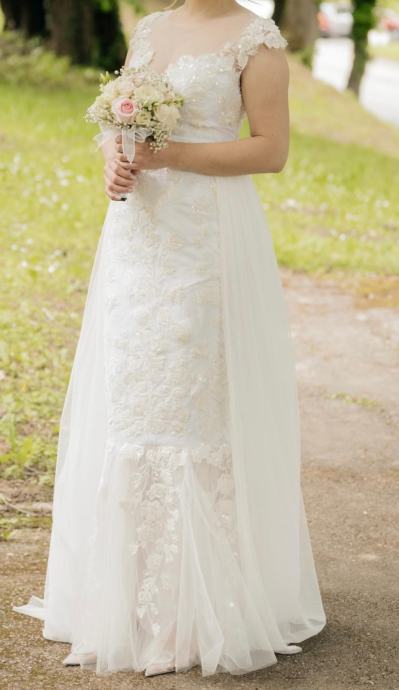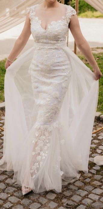 Prodaje se vjenčanica šivana po mjeri. Veličina između 36 i 38, visina mladenke 168cm, težina 62kg. Moguća korekcija vjenčanice. Uz nju idu šlep i marama za crkvu. Cijena 650e, lokacija Križ (Zagrebačka županija). Kontakt broj: 0992645002