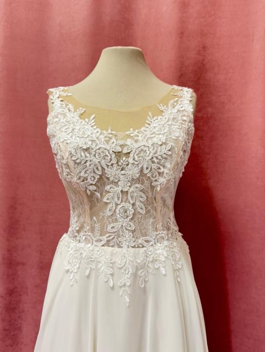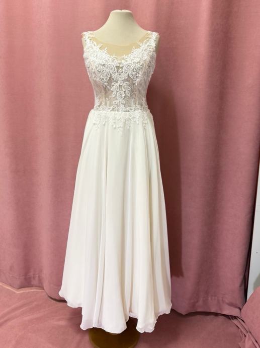 Prodajem prekrasnu vjenčanicu s ručno izrađenim čipkanim gornjim dijelom i lagano strukirom haljinom. Gornji dio je bogato ukrašen detaljnim čipkastim aplikacijama s cvjetnim motivima, a donji dio je izveden od glatkog bijelog materijala s prostranom suknjom koja pada u A-kroju. Haljina ima elegantne ramene bretele također od čipke, a izrez lijepo naglašava dekolte. Kombinacija prozirnog čipkanog dijela i punije suknje daje klasičan i romantičan izgled.