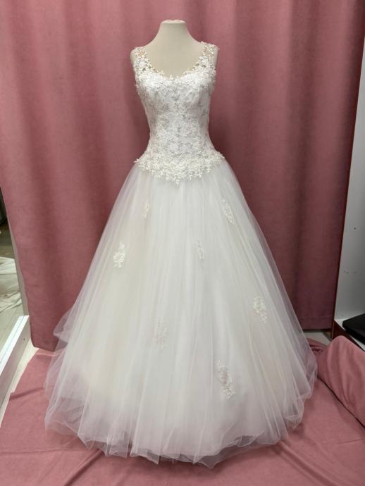Prodajem prekrasnu vjenčanicu u klasičnom princess stilu. Gornji dio haljine je bogato ukrašen detaljnim čipkastim aplikacijama s bisernim i srebrnim vezom koji se spuštaju prema struku, dok je suknja izrađena od višeslojnog tila koji stvara voluminozan i romantičan izgled. Bretele su također ukrašene čipkom koja se nastavlja na ramena. Dekoltej je u V obliku, a korset lijepo naglašava figuru. Boja je bijela s blagim srebrnim detaljima u vezu.