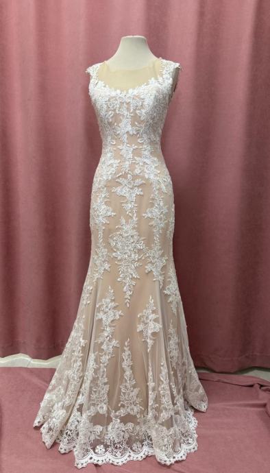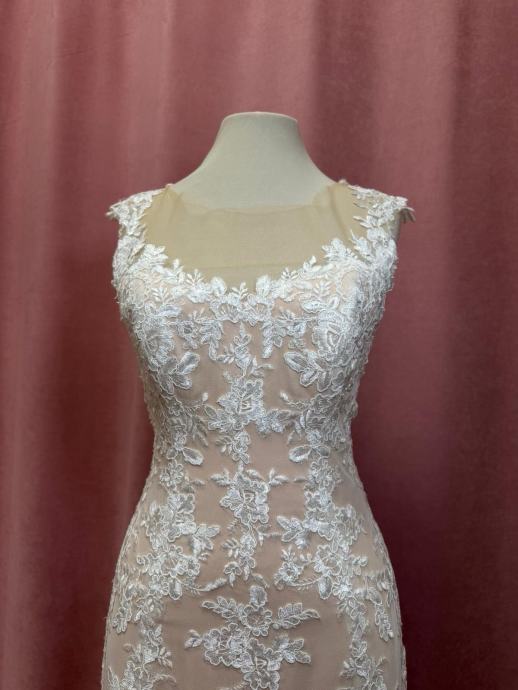 Prodajem prekrasnu vjenčanicu u boji šampanjca s bogatim bijelim čipkastim detaljima. Haljina je sirena kroja, elegantno prianja uz tijelo i širi se prema dnu. Čipka ukrašava cijelu haljinu, stvarajući romantičan i klasičan izgled. Dekoltej i ramena su nježno oblikovani čipkanim detaljima koji dodaju sofisticiranost. Haljina ima prozirne elemente kroz koje se vidi podstavna boja, a čipkasti ukrasi se nastavljaju sve do poda.