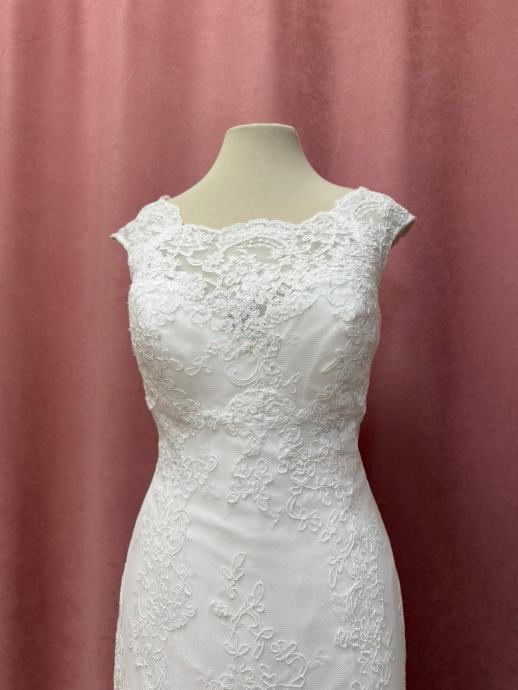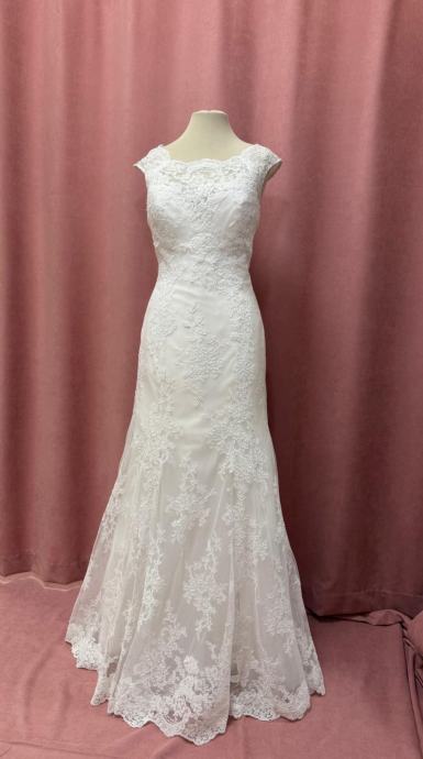Prodajem prekrasnu bijelu vjenčanicu ukrašenu nežnom čipkom. Haljina je elegantnog kroja s naramenicama od čipke i boat izrezom koji naglašava vrat i ramena. Čipkani detalji protežu se po cijeloj haljini, stvarajući romantičan dojam. Kroj prati liniju tijela i blago se širi prema dnu, završavajući čipkanim rubom koji dodaje poseban šarm. Haljina je nošena jednom, na vjenčanju.