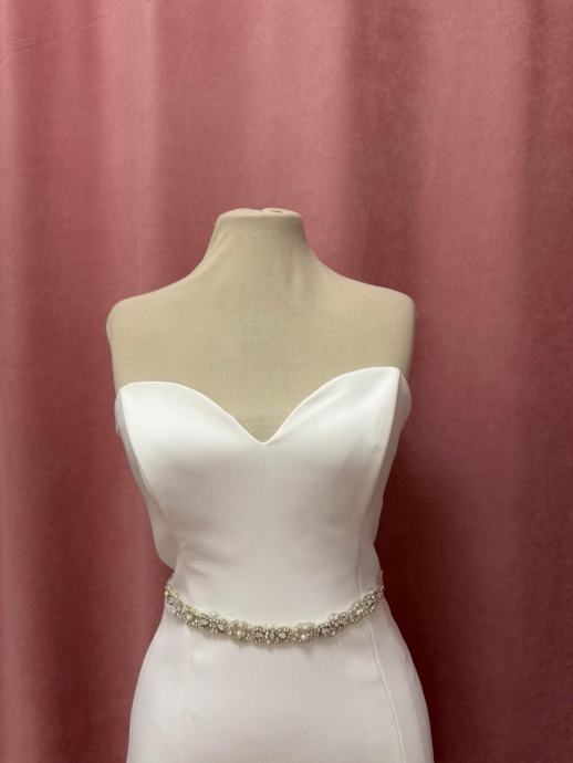 Dolazi s dva prelijepa ukrasna pojasa koja se mogu kombinirati – jedan s kristalnim detaljima za struk i drugi kao ogrlica ili ukras za kosu. Oba su bogato ukrašena biserima i kristalima koji dodaju dašak glamura.