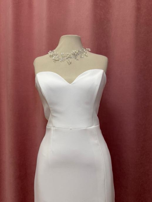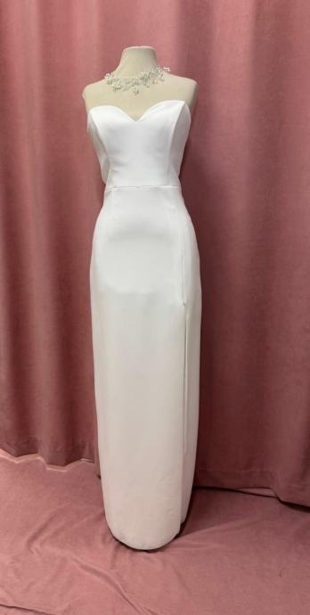 Prodajem prekrasnu bijelu vjenčanicu u elegantnom, modernom dizajnu. Haljina je bez naramenica s klasičnim srceastim izrezom koji naglašava dekolte. Kroj je pripijena i duga do poda, savršena za vitkiju siluetu.