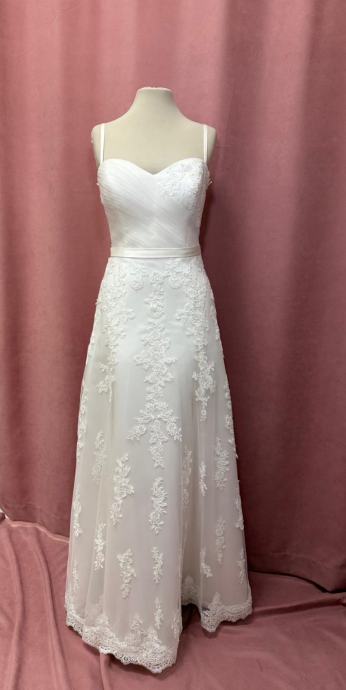 Prodajem prekrasnu bijelu vjenčanicu s tankim bretelama i srcolikom linijom izreza. Gornji dio haljine ima elegantan nabrani efekt od laganog materijala, a ukras od čipke s cvjetnim motivima dodaje romantičan dojam. Suknja dužine do poda također je bogato ukrašena čipkanim aplikacijama s cvjetnim detaljima. Pojas na struku je satenski i može se vezati u mašnu. Kroj je klasičan A-linija, koji lijepo pada i odgovara raznim tipovima figure.