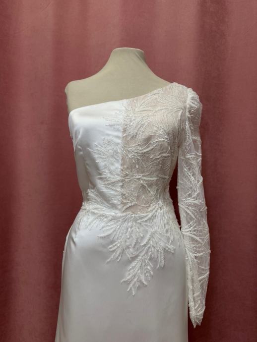 Prodajem prekrasnu bijelu vjenčanicu asimetričnog kroja s jednim dugim rukavom. Haljina je elegantnoga izgleda, ukrašena nježnim vezom i aplikacijama koje se protežu preko ramena i rukava te spuštaju prema tijelu. Kroj je uski s laganim proširenjem prema dnu, čime naglašava siluetu. Rukav je dugačak, izrađen od prozirnog materijala s detaljnim vezom. Vjenčanica ima sofisticiran i moderan dizajn, savršena za poseban dan.