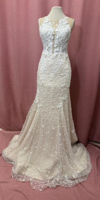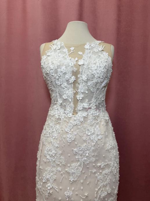 Prodajem prekrasnu vjenčanicu u boji šampanjca s bogatom čipkanom aplikacijom i prozirnim detaljima. Haljina je sirena kroja s dugačkom repom, ukrašena bijelom čipkom i delikatnim perlicama po cijeloj površini. Gornji dio ima prozirni panel na leđima s čipkanim ukrasima, a dekolteu dominiraju voluminoznije cvjetne aplikacije. Donji dio se elegantno širi prema podu, završavajući s čipkanom obrubom. Haljina ima ugrađenu podstavnu boju u nijansama nude tona koja lijepo naglašava čipkaste detalje.