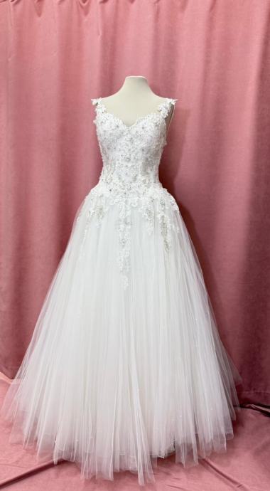 Prodajem prekrasnu vjenčanicu u klasičnom A-kroju. Haljina je bijele boje s nježnim srebrnim detaljima. Gornji dio je bogato ukrašen čipkom, perlicama i aplikacijama koje se protežu i niz tijelo haljine. Dekoltea je V-oblika s tankim bretelama ukrašenim cvjetnim detaljima. Suknja je eteričnog izgleda, izrađena od višeslojnog tila koji pruža volumen i romantičan dojam. Čipkani ukrasi sa srebrnim nitima prekrivaju gornji dio suknje i postupno se spuštaju prema dolje, stvarajući elegantan prijelaz.