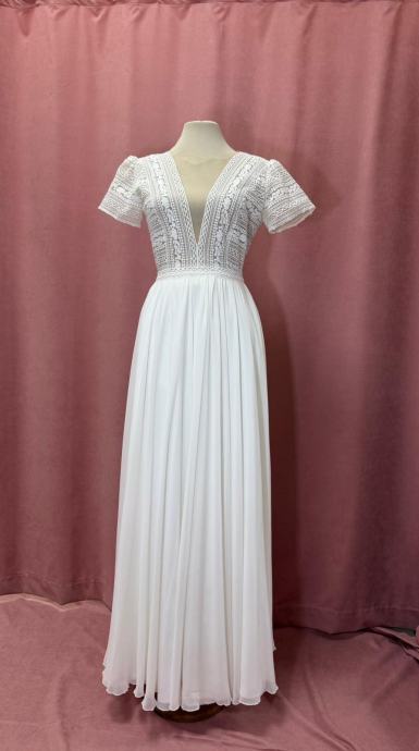 Prodajem prekrasnu vjenčanicu bijele boje s elegantnim detaljima. Gornji dio haljine je bogato ukrašen strukturiranim uzorkom s perlicama i aplikacijama koje stvaraju efektan izgled, dok su kratki rukavi također ukrašeni istim detaljima. Duboki V izrez dodaje dašak moderne elegancije. Suknja je lagana i prozračna, s naboranim krojem koji pada do poda. Haljina ima romantičan i boemski štih, savršena za poseban dan.