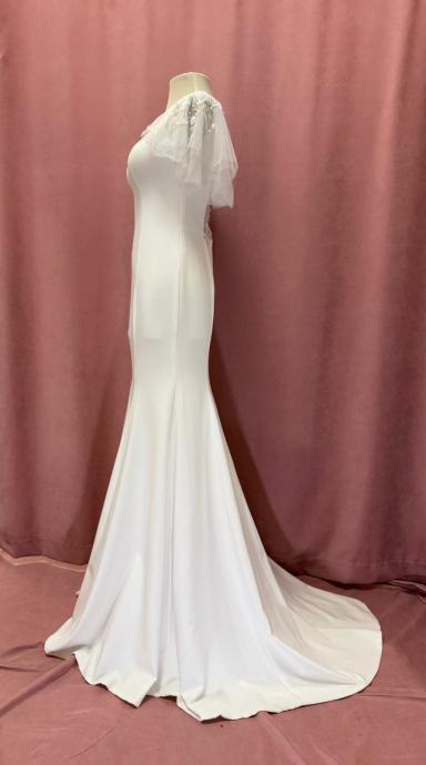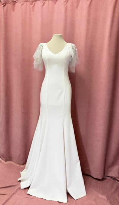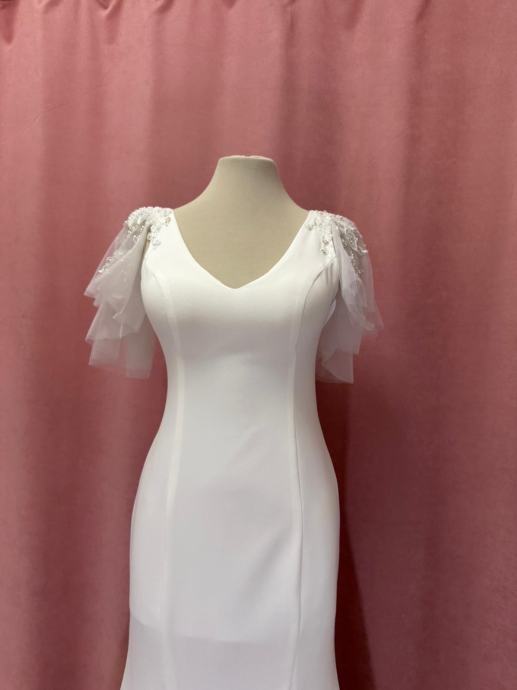 Prodajem elegantnu bijelu vjenčanicu modernog kroja. Haljina je klasične sirena siluete s decentnim V-izrezom i kratkim rukavima od prozračnog tila. Rukavi su nježno ukrašeni biserima i aplikacijama koje dodaju romantičan detalj. Haljina elegantno pristaje uz tijelo i proširuje se ispod koljena, završavajući dugačkom leđom. Jednostavan, ali sofisticiran dizajn koji naglašava figuru.