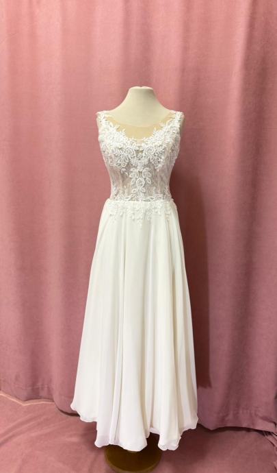 Prodajem prekrasnu vjenčanicu u bijeloj boji s elegantnim detaljima. Gornji dio haljine ukrašen je raskošnom čipkom s cvjetnim motivima koja se proteže preko dekoltea i ramena, dok je donji dio izrađen od glatkog, струјećeg materijala koji pada u prostranu A-liniju. Vjenčanica ima prozirni gornji dio s apliciranom čipkom koja stvara romantičan izgled, a detalji čipke spuštaju se i na struk. Dizajn je bez rukava s nježnim izrezom.