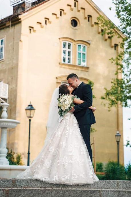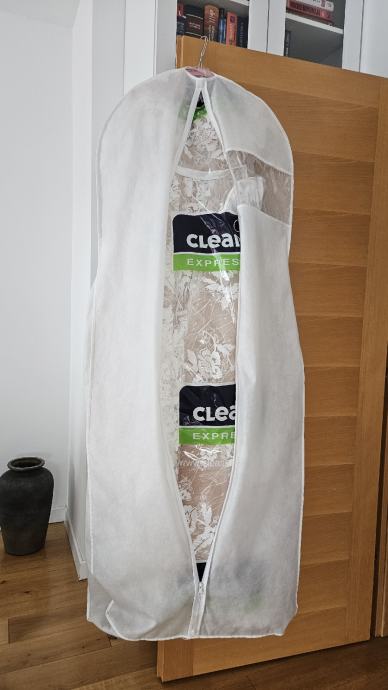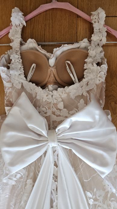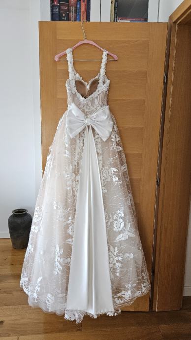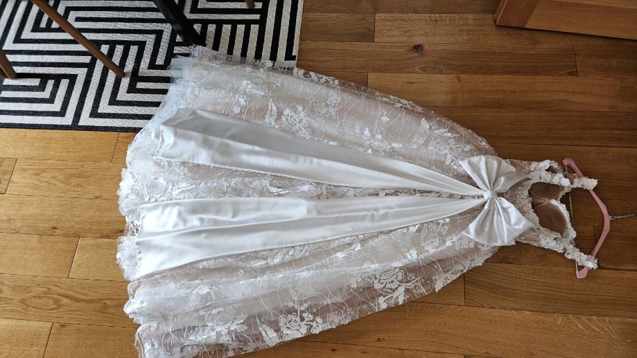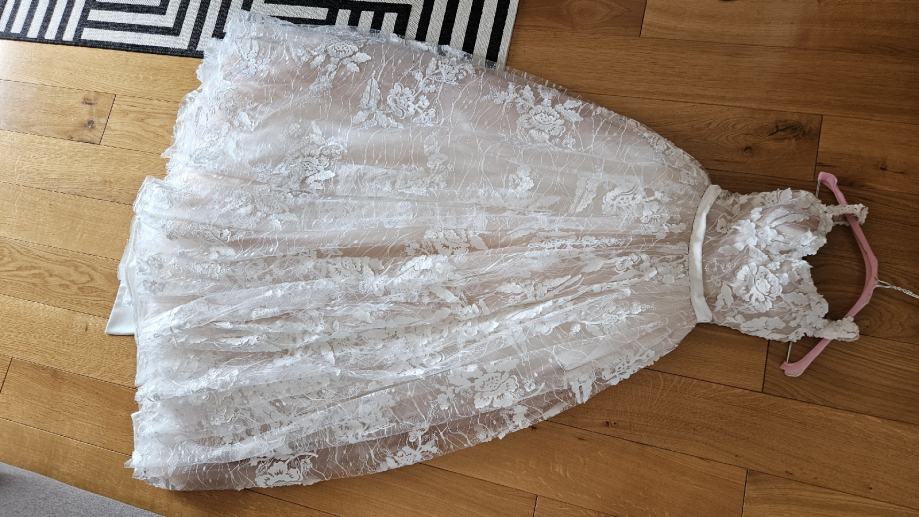 Vjenčanica je nošena oko 2h za obred u Staroj gradskoj vijećnici i slikanje te je nakon toga skinuta i više nije nošena. Kemijski je očišćena. Sweetheart neckline, A line. Naramenice se mogu nositi spuštene ili podignute. U vjenčanicu je ušiven push up grudnjak veličine B koji se lako može skinuti i zamijeniti vašim. Uz vjenčanicu dolazi i podsuknja/obruč kako bi silueta bila besprijekorna.