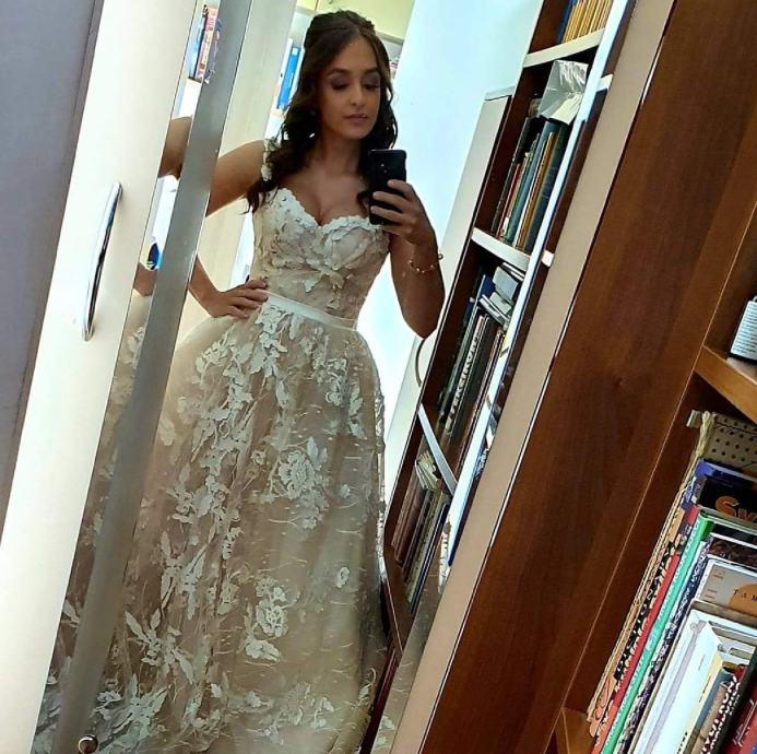 Moja visina: 157cm, vjenčanica je nošena uz potpetice od 10cm (može je nositi i nešto viša djevojka, zbog viška materijala)