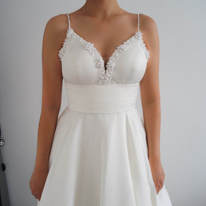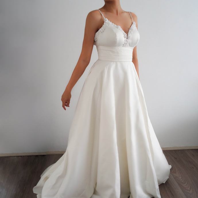 Moje mjere su: 85-72-85 i vjenčanica mi savršeno pristaje, ima zatvarač na stražnjoj strani. Visoka sam 1,73 m i na fotografijama nemam cipele.