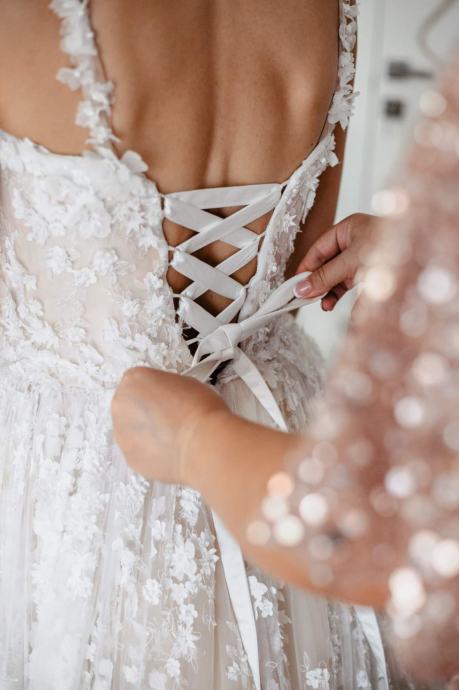 Prodajem vjenčanicu kupljenu u Sposi. Na haljinu su ušiveni dodatni gušći cvjetići za glamurozniji i bogatiji efekt 3D čipke. Dodane su naramenice u koje su također ušiveni cvjetići. Naramenice su rastezljive tako da se mogu bez problema dizati ruke u zrak, također se može nositi i kao dignute naramenice na ramenu. Haljina je za veličinu 36, ali se zbog korzeta može prilagoditi, dužina također. Visoka sam 171cm, pete su bile 10cm. Haljina je očišćena i može se isprobati u Samoboru.