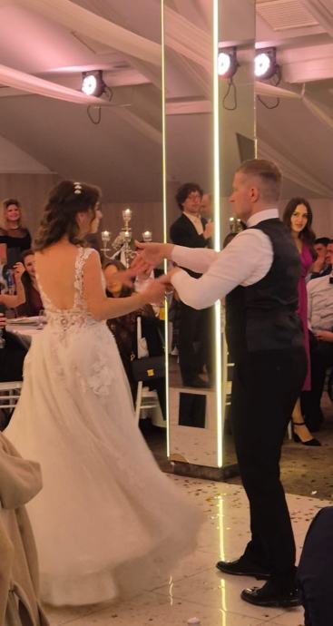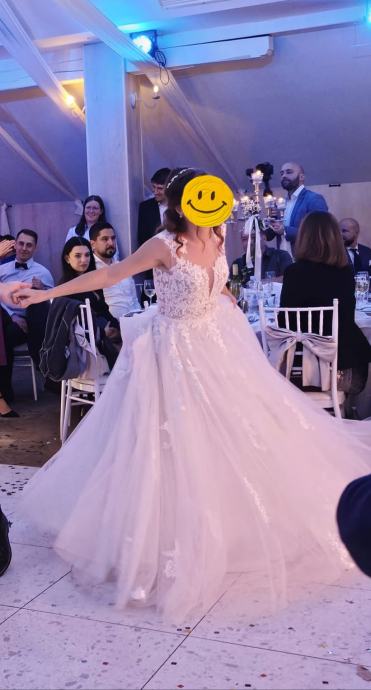 Prodajem svoju vjenčanicu kupljenu u Vesni Sposi, jednom nošenu i kemijski očišćenu (UK br.10), a cijena je 500 eura. Visoka sam 166 cm i imala sam pete od 7 cm te inače nosim broj 36/38.
