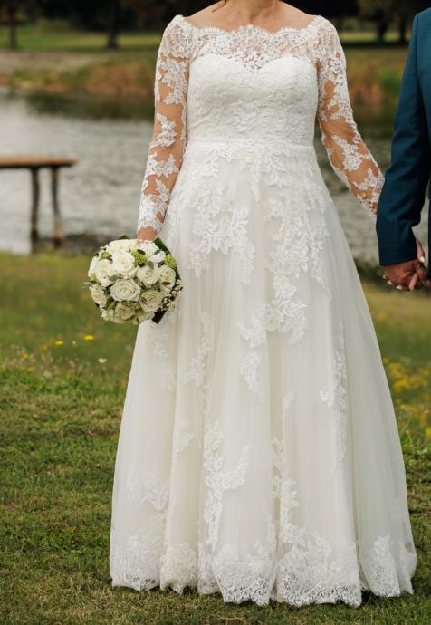 Predivna vjenčanica sa bundicom roza boje. Nošena jednom i očišćena u kemijskoj čistionici za 130 eura. Iza ima vezice pa se može korigirati veličina od 38 do 42. Lijepo pada jer ima više slojeva tila i jako je udobna. Što puno znači.