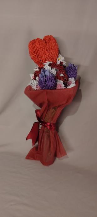 Prodajem ručno rađen 3D origami buket koji se sastoji od više cvjetnih kompozicija i velikog srca izrađenih tehnikom modularnog origamija. Buket uključuje cvijeće u nijansama ljubičaste, bijele, roze i crvene boje, a središnje mjesto zauzima srce.