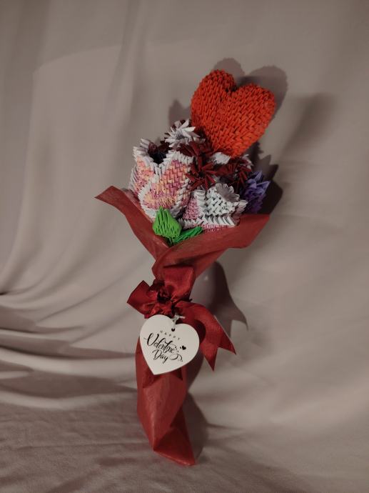 Buket je potpuno ručni rad, izrađen od papira složenog u module. Može poslužiti kao trajna dekoracija ili poklon za posebne prilike poput vjenčanja, obljetnica ili Valentinova.